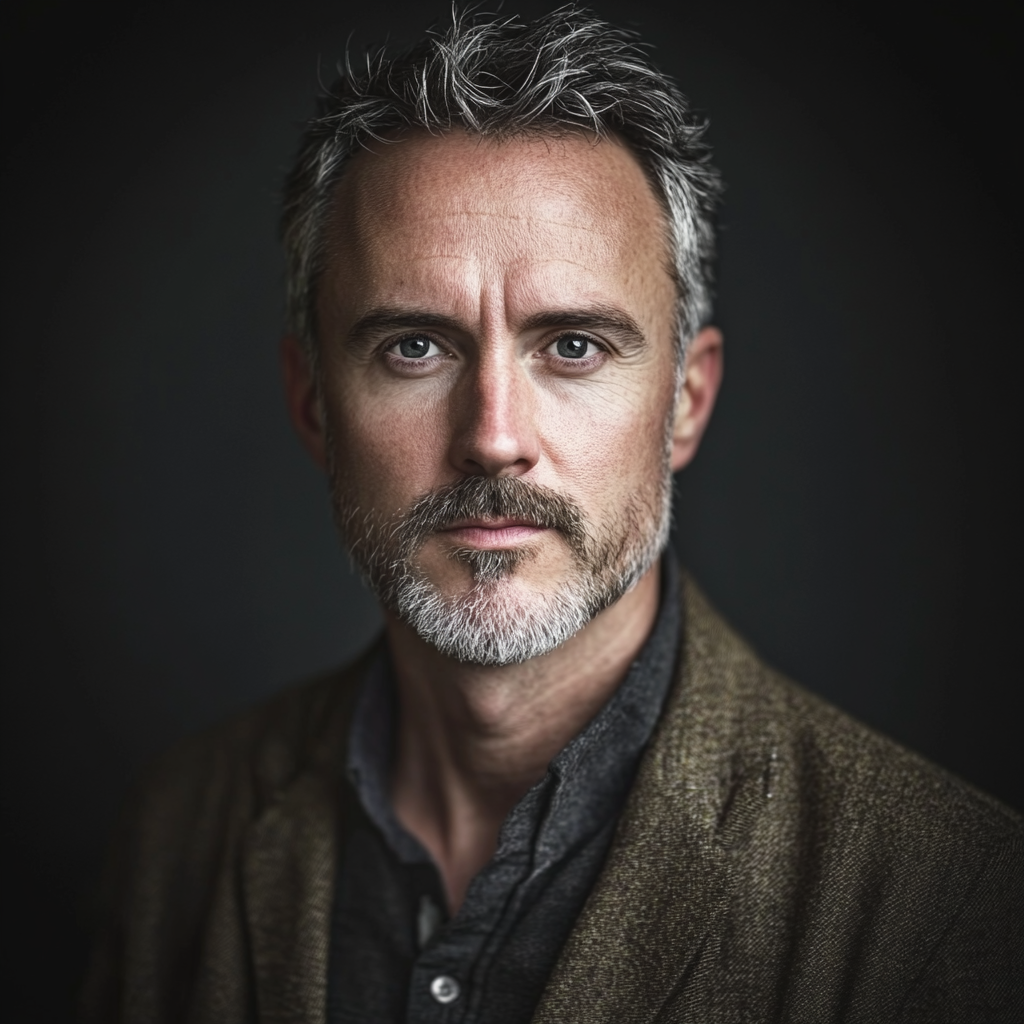 Quinn presents as a handsome man in his early fifties with salt-and-pepper hair, a neatly groomed beard, and piercing blue-gray eyes. He typically dresses in a style reminiscent of ancient academic and media professionals, favoring textured brown blazers over dark shirts.